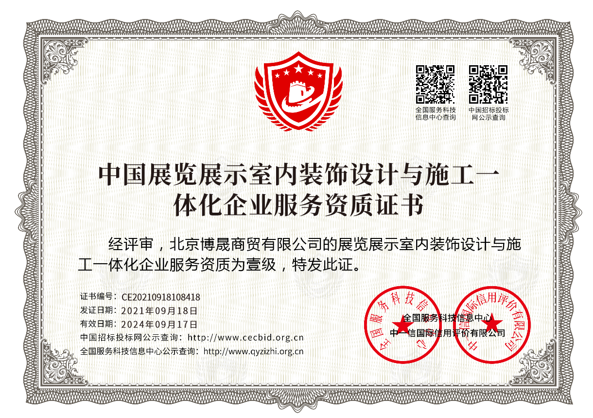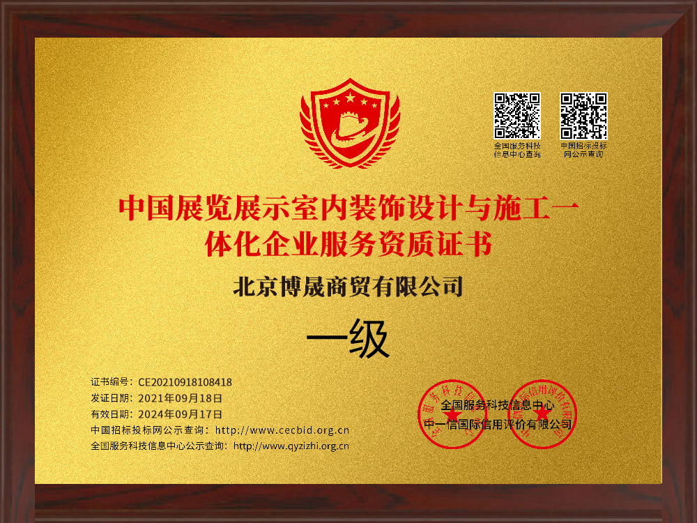 中國展覽展示室內裝修設計與施工一體化企業服務一級資質